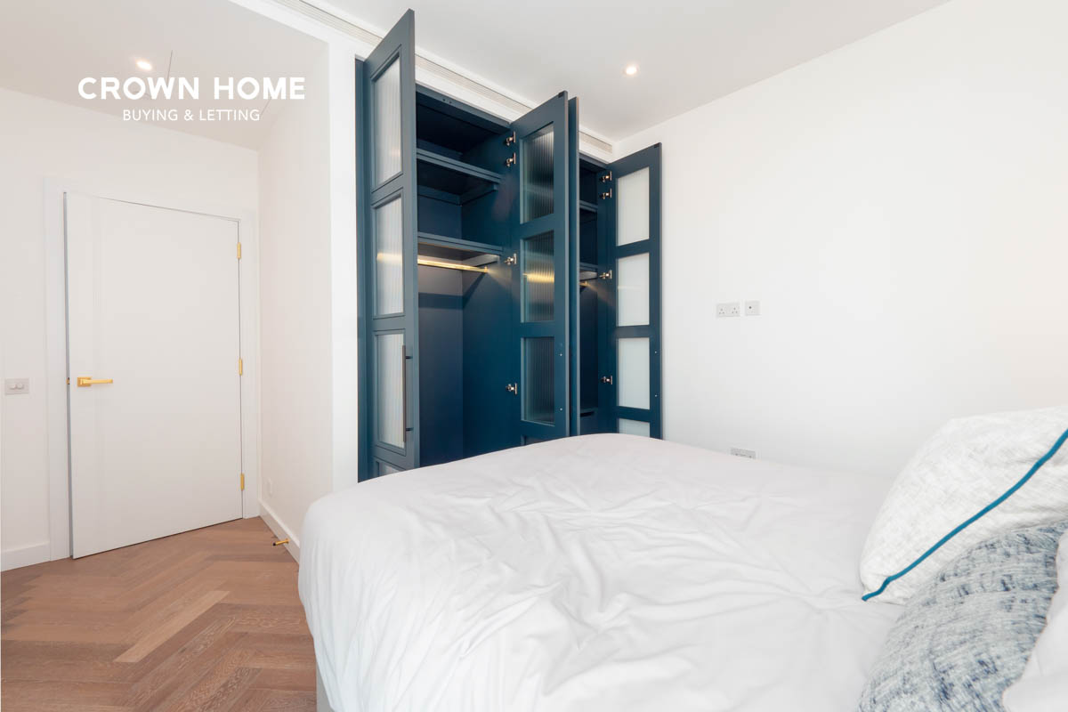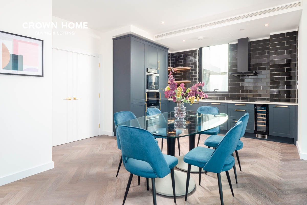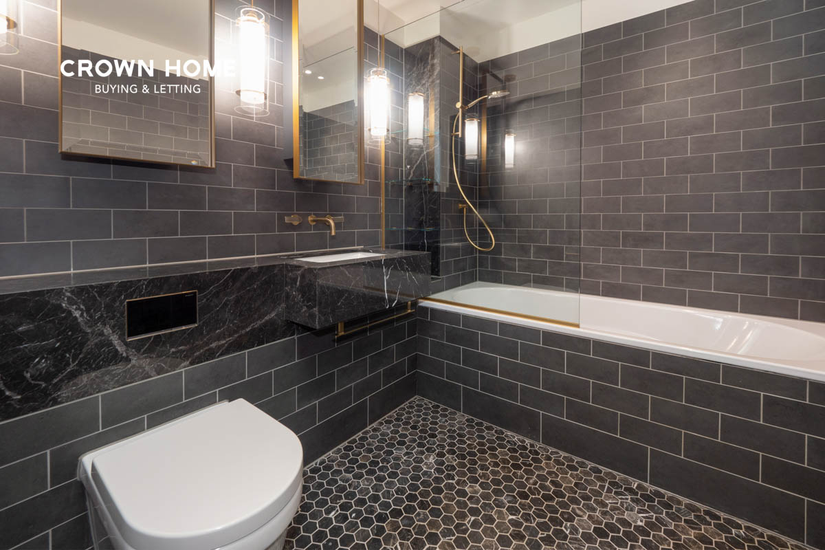 This triple-aspect apartment benefits from floor-to-ceiling windows that wrap around the home flooding it with natural light and creating a calm and tranquil sanctuary in the sky. The modern, fully fitted kitchen is the perfect spot to test your culinary skills and benefits from a window that perfectly frames the Shard. The living and dining space features amazing herringbone flooring, the design specifically tailored to maximise space, comfort and light. From the living space it leads out balcony, this is a truly amazing vantage point. Featuring awe-inspiring views across the Thames, it’s the perfect place to take a quiet moment, far above the clamour of the big city. With two double bedrooms that offer amazing views of London, this apartment promises to impress from dawn to dusk. There’s also plenty of storage space throughout. The bathrooms are impeccably rendered ensuite, with a classic tiled finish, with either a walk-in shower or bathtub, and mirrored units.